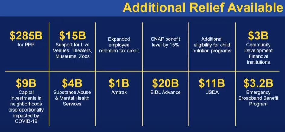 All those funds are a drop in the bucket when seen alongside the more than $350 billion the federal government is giving the state for a new paycheck protection program; support for live venues and the arts community; increased SNAP benefits; and substance abuse/mental health programs, among others. Those checks won't just appear in your mailbox, however. In most cases, businesses will need to apply for the relief.