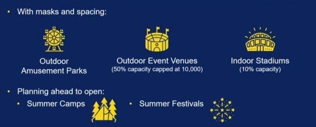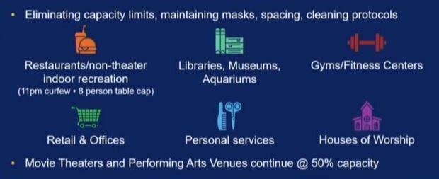 - Indoor recreation (excludes theaters, which will continue to have a 50 percent capacity)