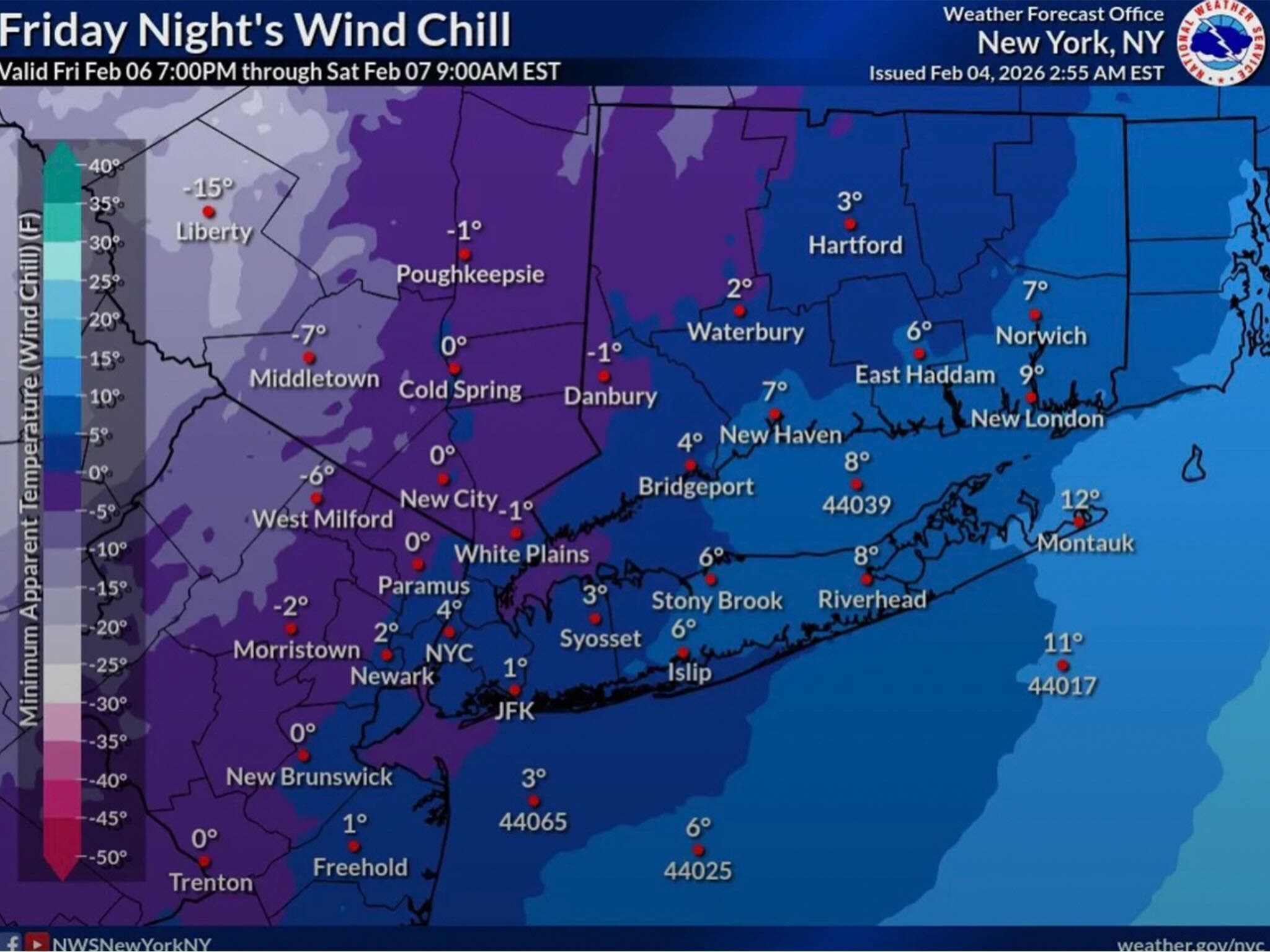 “More importantly, strong wind gusts and dangerously low wind chills are expected through much of the weekend! -10 to -35 wind chills at times!” WTNH meteorologists reported.