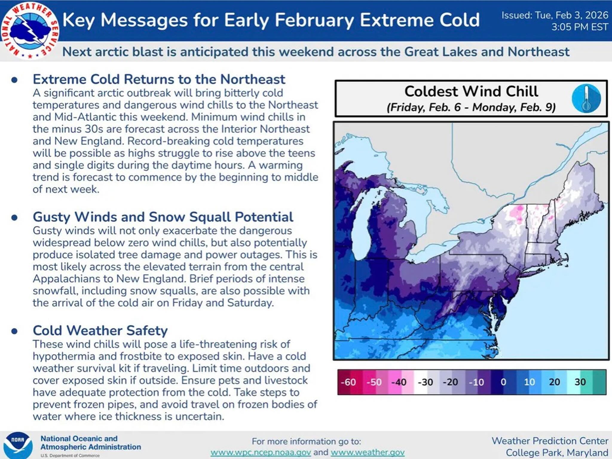 “An Arctic air mass combined with strong northwest winds may produce very cold to dangerous wind chills from Saturday night into Sunday morning,” the notice states. “Lowest wind chill values expected during the late night and early daylight hours, and could be as low as 15 to 20 below zero.”
