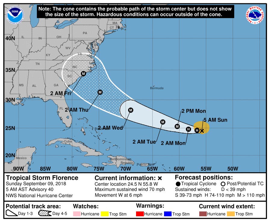 The latest track from the National Hurricane Center brings Florence into the western Atlantic by Wednesday, according to the National Weather Service. At that point, there is still uncertainty with the eventual track of Florence.
