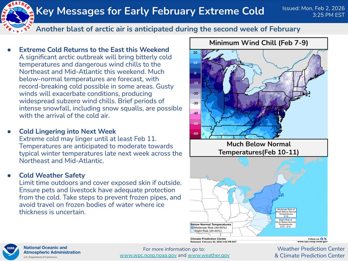 “A significant arctic outbreak will bring bitterly cold temperatures and dangerous wind chills to the Northeast and Mid-Atlantic this weekend,” the National Weather Service reports. “Much below-normal temperatures are forecast, with record-breaking cold possible in some areas. Gusty winds will exacerbate conditions, producing widespread subzero wind chills. Brief periods of intense snowfall, including snow squalls, are possible with the arrival of the cold air.”