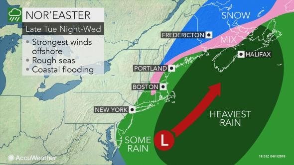 "While the daylight hours are expected to remain dry, rain will overspread the region after sunset and continue through the night before dry weather returns on Wednesday ... After remaining several degrees below normal on Tuesday, high temperatures on Wednesday will rebound to around 60 across much of the area, a few degrees above normal for early April."