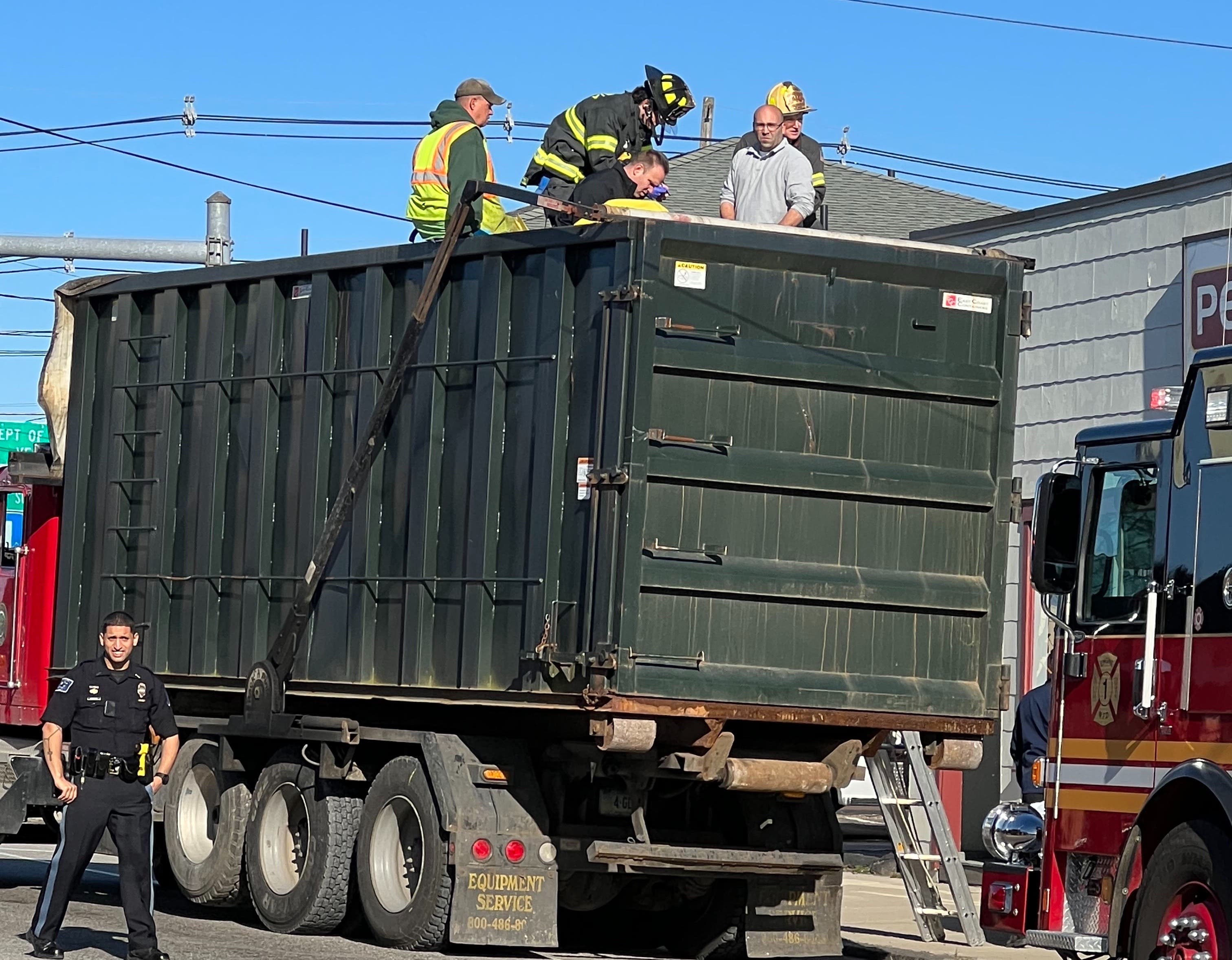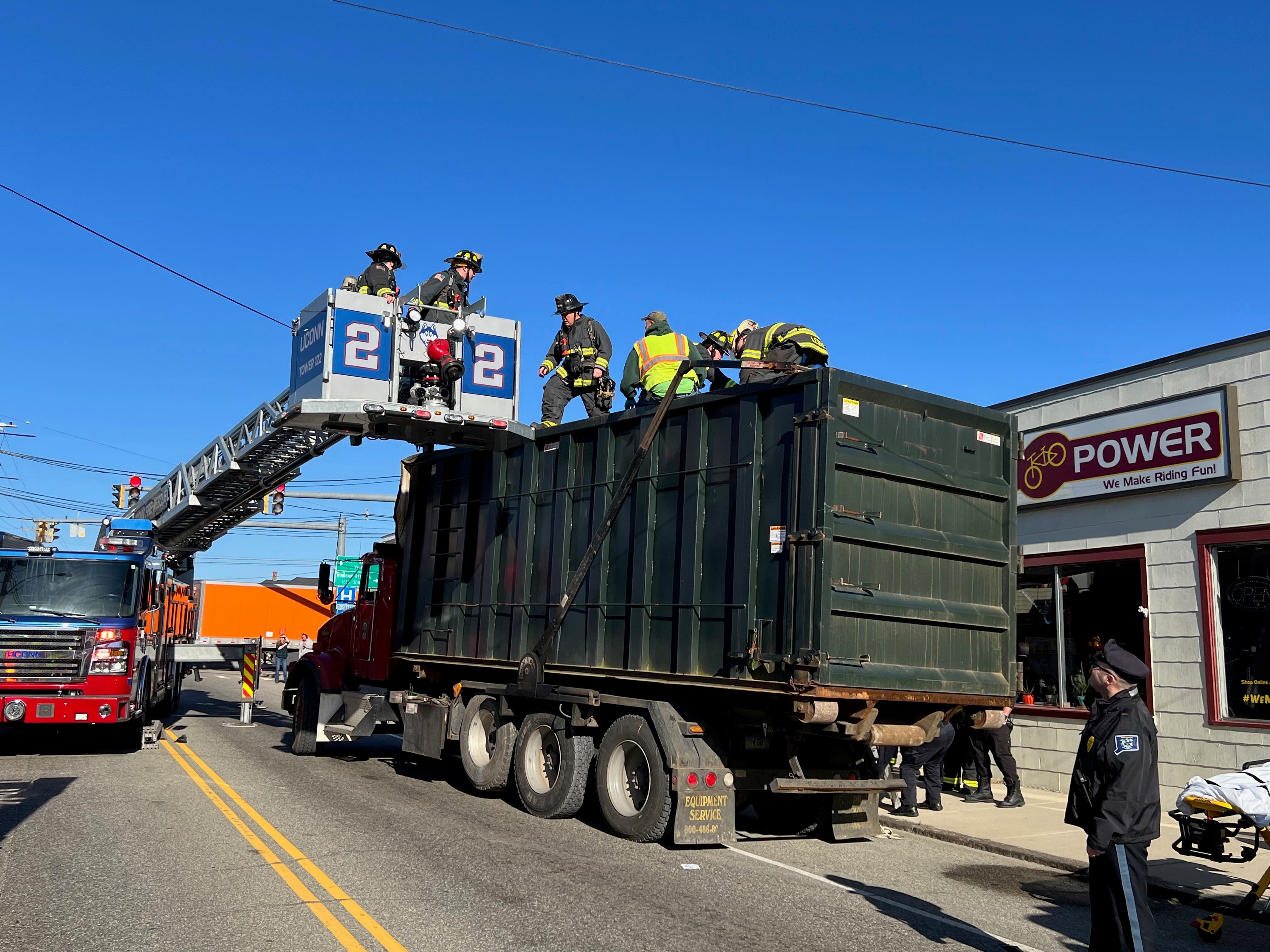 Firefighters, employing a UConn fire ladder truck, climbed in to the dumpster truck to retrieve the man, who was soon flown via LifeStar to Rhode Island Hospital's Burn Center.