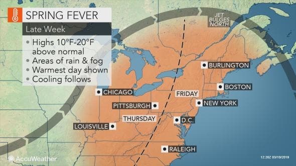 "A strong southerly flow of air from the Gulf of Mexico will pump in even milder air across the Northeast later this week, making it feel more like spring," AccuWeather Meteorologist Brett Rathbun said. Highs may be as much as 20 degrees above mid-March normals on the warmest days.