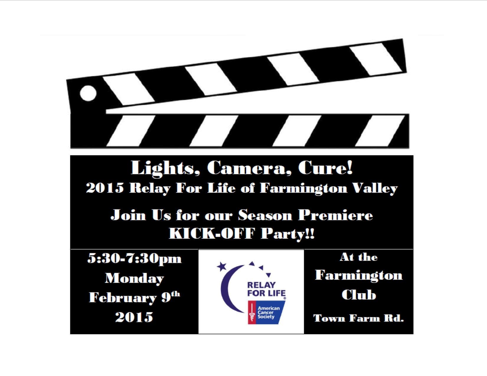 Lights, Camera, Cure! Please join us for American Cancer Society 2015 Relay For Life of Farmington Valley “Season Premiere” KICKOFF Party February 9 from 5:30 to 7:30 at the Farmington Club.