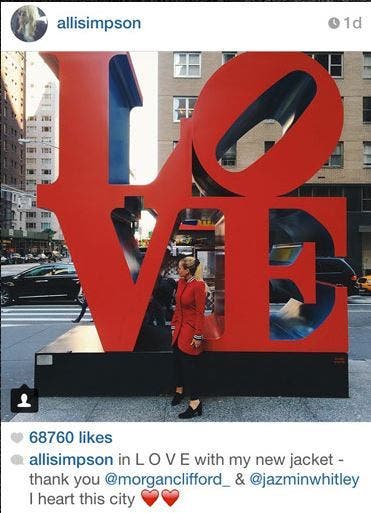 Ali Simpson, the sister of young star Cody Simpson recently wore a coat that Clifford designed. She Instagrammed a photo to her more 1.6 million fans.