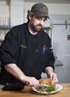 Photos: Matt Tofil, executive chef; eggplant involtini with ratatouille; black bean & quinoa vege burger with chipotle; house-made pita; stuffed poblano pepper; roasted chicken with vegetable couscous; Chef Tommy Stueville; Dog Days of Winter poster.