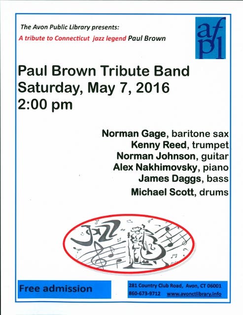 The performance will be a special musical salute to Connecticut jazz legend Paul Brown featuring Norman Gage on baritone sax, Kenny Reed on trumpet, Alex Nakhimovsky on piano, Norman Johnson on guitar, James Daggs on bass, and Michael Scott on drums.
