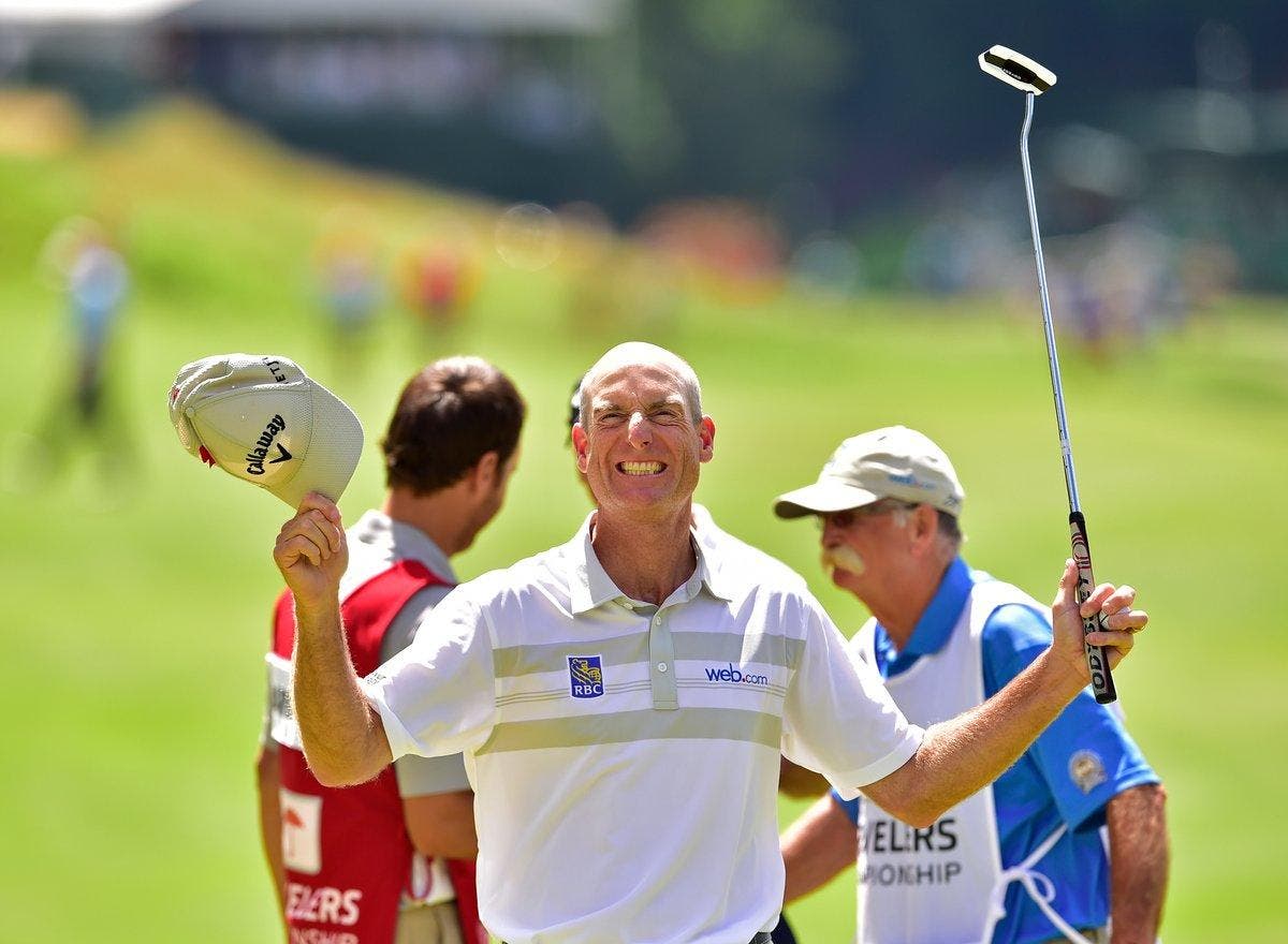His first putt from 27 feet ran about two feet past the hole, then he cleaned it up with a par putt as the fans surrounding the amphitheater-type 18th hole roared with approval.