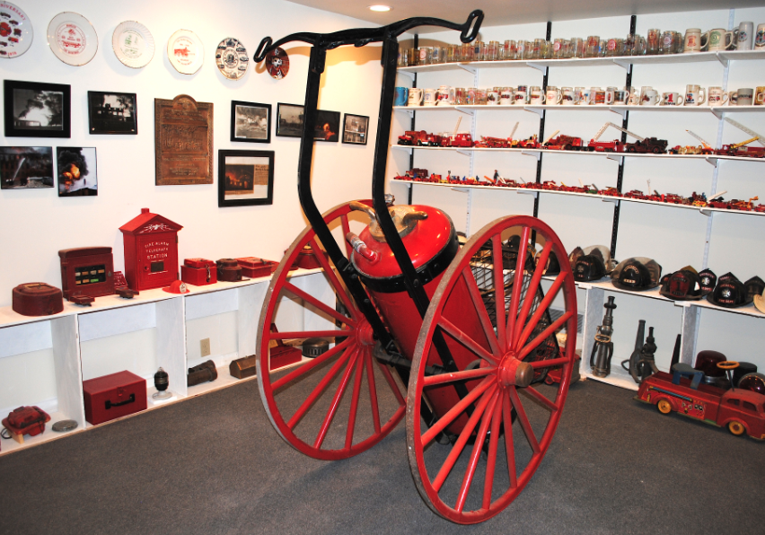 Dugdale has collected and restored dozens of miniature fire trucks, fire extinguishers, fire patches and badges that are on display, but his pride and joy is the 1831 hand pump. “It took four or five guys to work this thing,” he laughed. “It’s called Old Forgotten.”