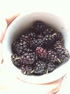 They say mulberries are sweeter than blackberries. That mulberries don't have the zing that a blackberry can have. For this mouth, there's no experience with which to compare as they were all given away, the rest of the bunch (at least half) to our upstairs neighbors.