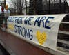 Various signs were placed among the items as well as tacked to poles and fences and on sandwich boards in front of businesses. Messages such as "Pray for our victims, town and country" and "Do not be overcome by life but overcome evil with good" and "Together we are strong."