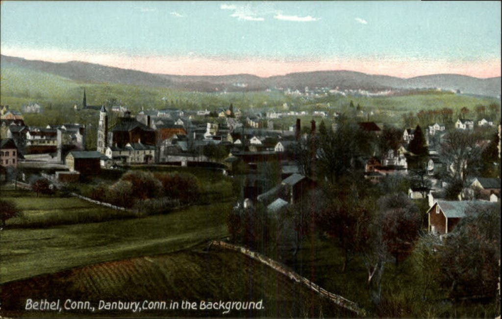 Bethel CT Bird-eye View c1910 Postcard, shows Danbury in the distance.