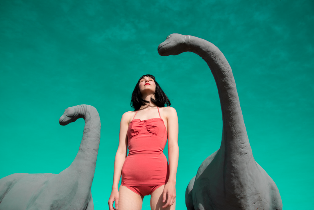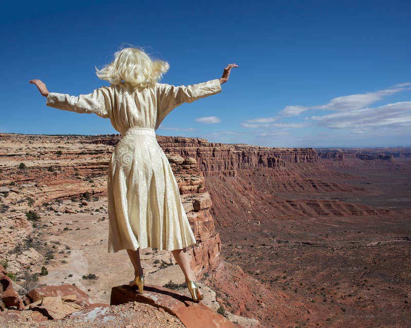 But get to know Cudzilo’s art and you realize that although the portraits are all of her, none are of herself. The women in Cudzilo’s work are characters, their story playing out across whatever landscape the photographer has chosen. She travels everywhere with a suitcase or backpack full of vintage clothes, matching whatever backgrounds she stumbles upon with the appropriate frock and wig.