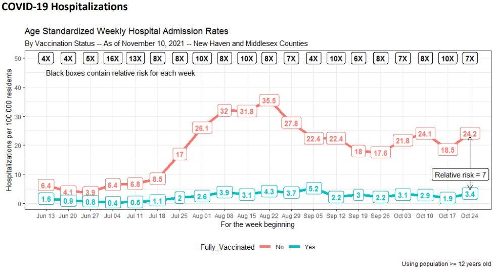 The charts above and below show the "relative risk," or the difference in risk when comparing rates between vaccinated and unvaccinated persons.