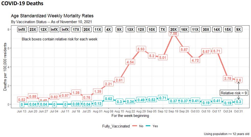 The latest data show unvaccinated residents have a nine times higher risk of dying from the coronavirus, compared to the vaccinated. Their risk of hospitalization is seven times greater.