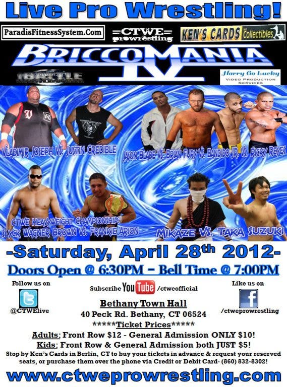 CTWE Pro Wrestling is a family-friendly wrestling promotion, and we return to our home at the Bethany Town Hall on Saturday, April 28th with BriccoMania IV!