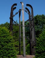 The New Haven Holocaust Memorial, located at the corner of Whalley Avenue and West Park Avenue in New Haven, was the country's first Holocaust Memorial built on public land when it was dedicated in 1977. Built solely through private donations by survivors, their neighbors and friends, the monument features a large sculpture with a Star of David base. Six curved bars wrapped in barbed wire symbolize Nazi concentration camps, and small evergreens in the monument's base honor the six million Jewish Holocaust victims.