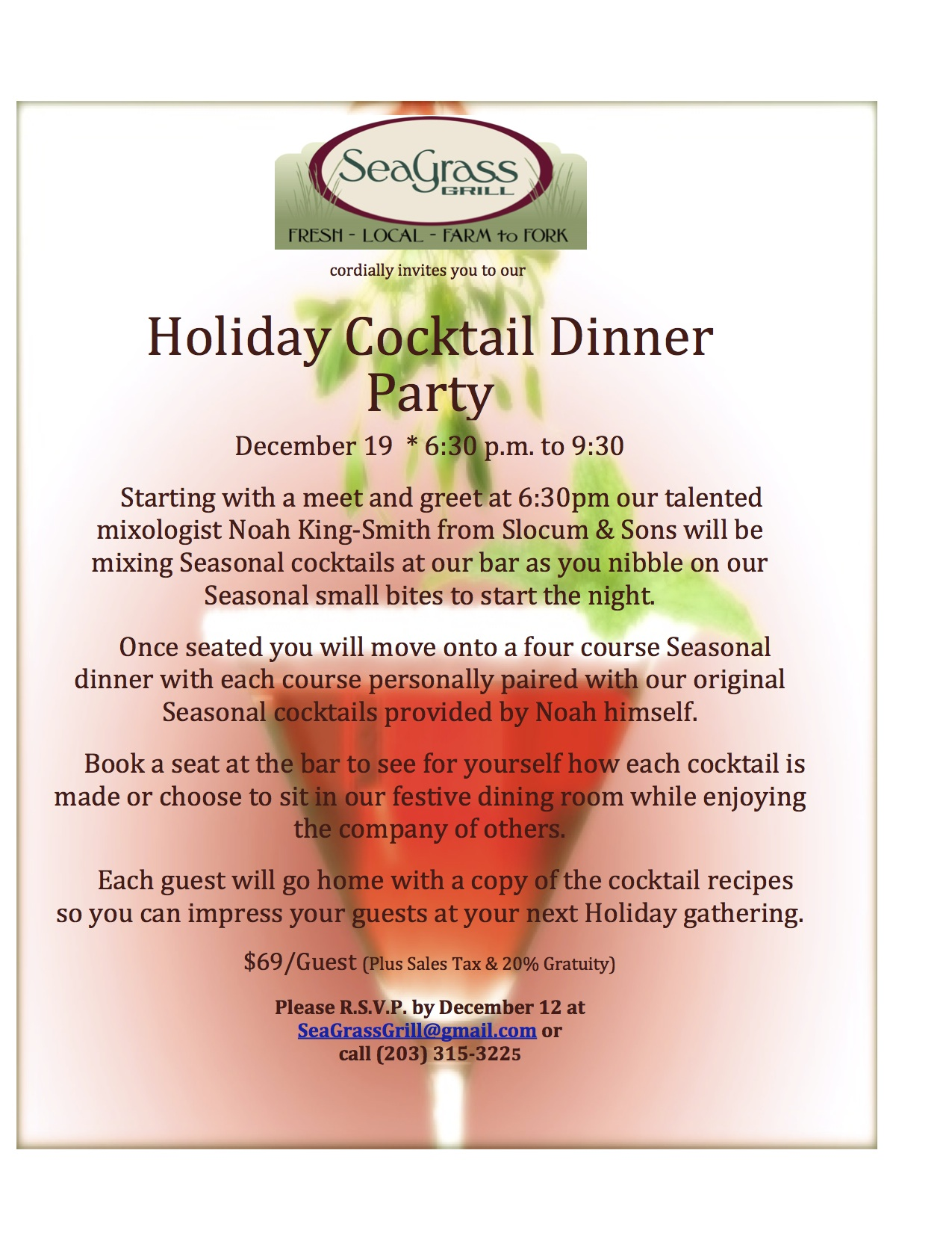 Only a few days left to reserve your seats and they're going fast. It's the perfect gift for just about anyone. Five hand crafted cocktails will be paired with a five course meal!! You won't go home hungry...or thirsty.
