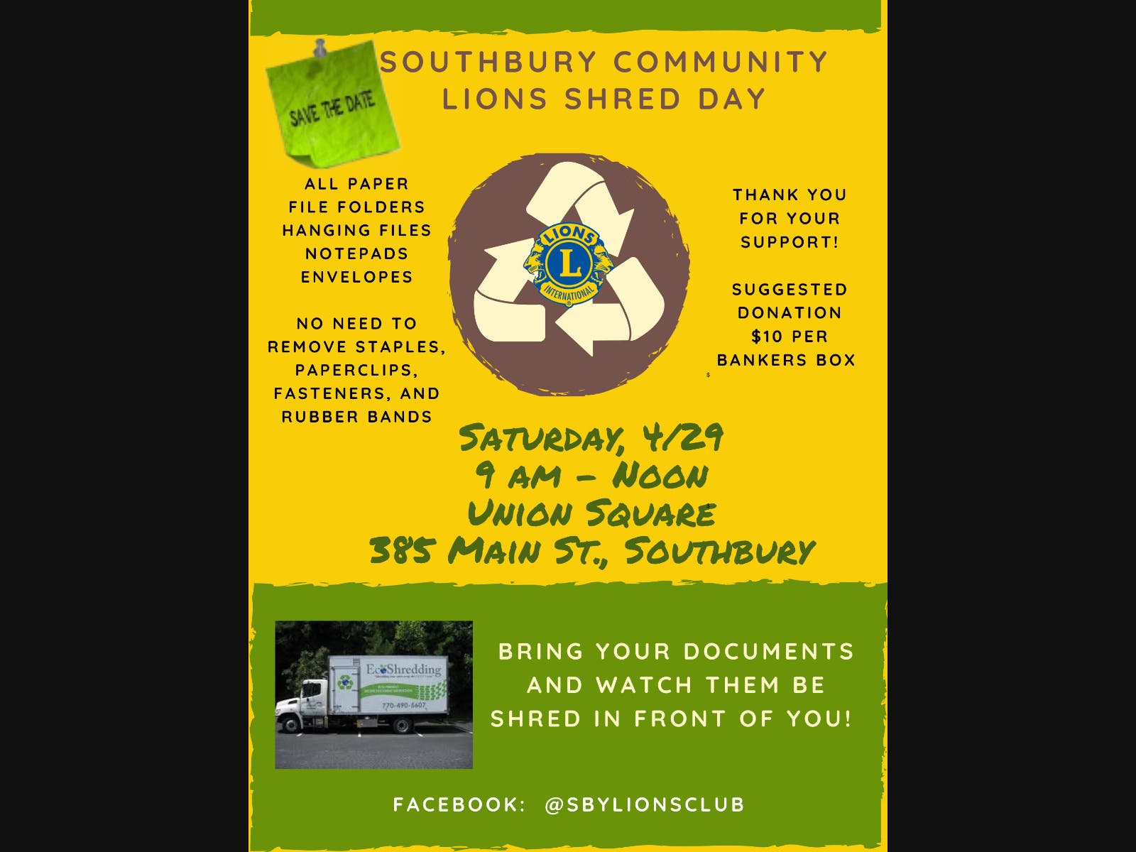 We look forward to seeing you on Saturday and to help you and the environment by shredding your documents. Also, talk to us about Southbury Community Lions, we welcome you to join us in service to our community!