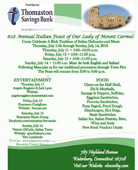 Celebrating the 81st Annual Italian Feast of Our Lady of Mount Carmel. This feast will open Thursday evening at 5:00 p.m. and conclude for the evening at 10:00 p.m.