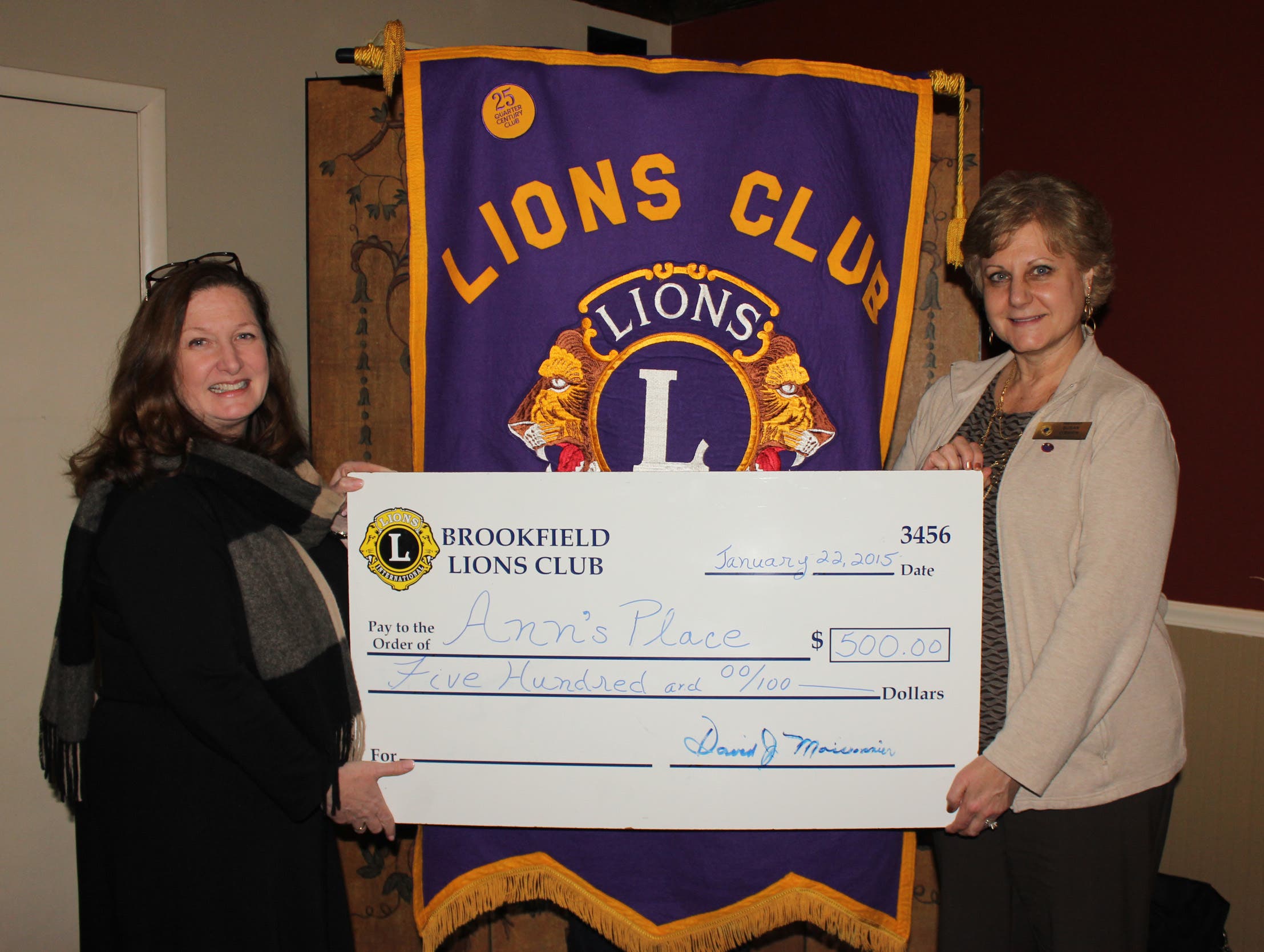 At a recent meeting of the Brookfield Lions, Ms. Catherine B. McGrath, Director of Development for Ann’s Place in Danbury CT, spoke about the Community Based Cancer Support programs and resources for individuals and families facing Cancer offered at Ann’s Place. She mentioned that professional counseling, support groups, wellness activities and more are offered at no charge. Their services help those living with Cancer create their own path to improving their quality of life. Pictured here is Ms. McGrath (L) receiving a $500 donation from the Brookfield Lions being presented by Lion Susan O’Brien President of the Brookfield Lions.