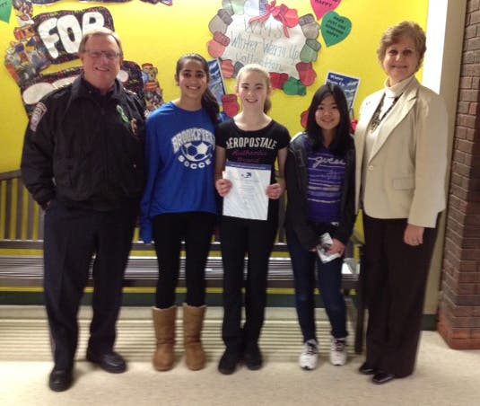 Brookfield Police Chief, Robin Montgomery, Past President of the Brookfield Lions Club, presented gift certificates to the winners of the Brookfield Lions Peace Poster contest. Pictured from (L-R) Chief Montgomery, Ms. Mariyam Quaisar, Second Place Award ($75), Ms. Emma Hasselman, First Place Award ($100), Ms. Fernanda Hanashiro, Third Place Award ($50) and Susan O’Brien President of the Brookfield Lions.
