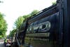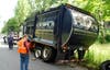 DWD employees arrived on the scene from Danbury and let the air out of the tires to lower the 12' 8" truck below the 12' 1" height limit of the bridge. After towing it forward to allow traffic to flow again, they inflated and replaced the tires on the shoulder of the road.