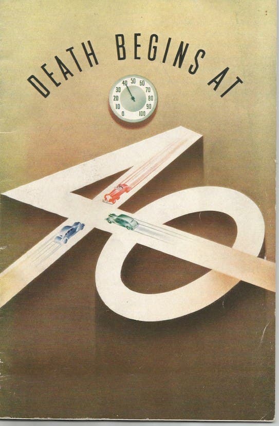 I am not too proud to admit I need a reminder every now and then, and nothing provided that better than this 1937 publication from the Traveler’s Insurance company. “Death Begins at 40” is a wonderful eye-catching provocative title even today. The stunning cover is a masterpiece of graphic design.