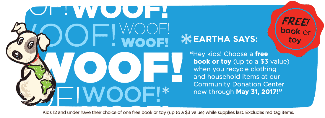 Have you met Eartha, our planet-friendly pup? Learn more about Eartha and how your child can earn a free book or toy! Now through May 31, 2017 Donate today and get a free coloring book and Coupon at the Community Donation Center! Get yours today!