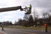 Installing high voltage fiber optical wires on Federal Road in Brookfield takes on dare devil tones as an electrician balances on helicopter runners.