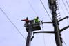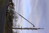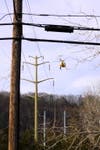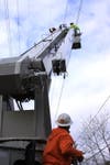 Two men got into the crane to do more of the same work at the top of the high voltage tower across the street. Renfro prepared the crane to ascend with Kevin Hare, of Florida, who has been running the lines for 10 years, and Keith Taylor from Indiana, who has been installing wires for about 30 years.