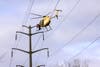 Against the grey backdrop of a windy Saturday, a bright yellow helicopter hovered over high voltage wires across the street from 777 Federal Road in Brookfield. A lone linesman stood on the runners of the helicopter as it bobbed in place while he attached the new wires to the old. The whirling blades were only a few feet from the head of the linesman, and as the wind blew, the blades whirled almost perilously close to the highly charged wires.