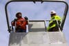 The men made their adjustments inside the bucket that would lift them up to the charged wires high above.