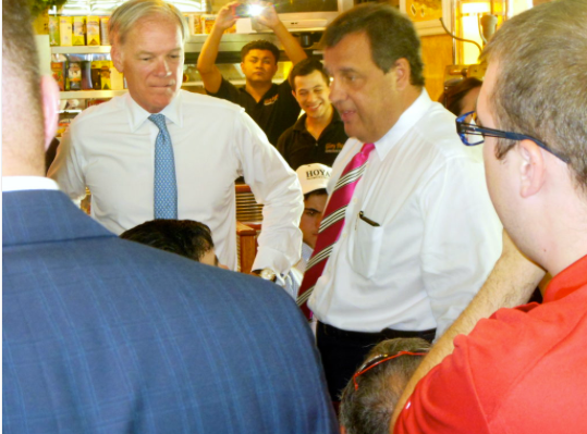 Photo: Tom Foley with NJ Gov. Chris Christie during a July 21 campaign stop in Greenwich. Credit: Barbara Heins.
