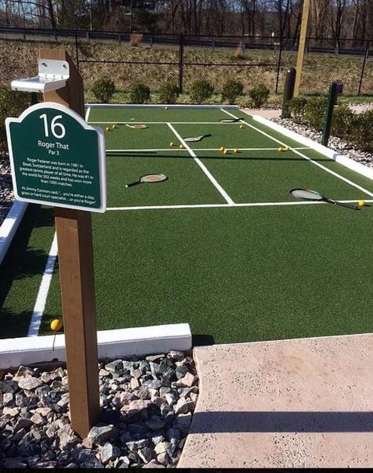 Among the themed holes are Heidi, which contains small goat poop barriers; a bobsled track/ski moguls, which roll downhill at the base of a Swiss Alp; and "Roger That," a tribute to tennis great Roger Federer featuring tennis balls and rackets as obstacles on a player's way to the hole.
