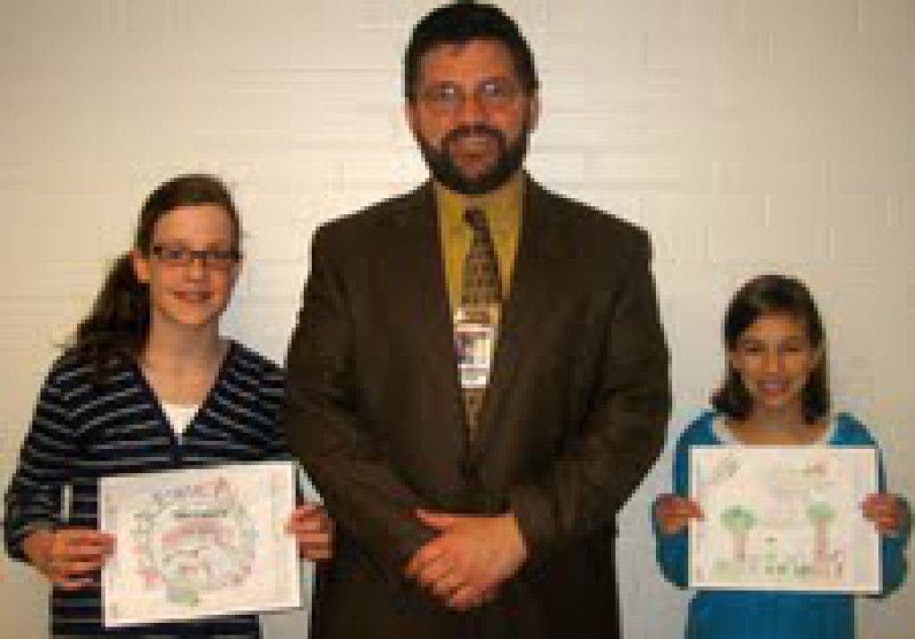 Chapman Elementary School students Elizabeth Boyer and Elli Haskes pose with their winning artwork, accompanied by Russell M. Hinckley, principal.