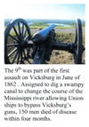 Arriving at Vicksburg on June 25th they found that Farrugut’s blue water fleet was forced to stop short of the Confederate batteries set high on a bluff overlooking the Mississippi. Even with Porter’s mortar fleet and soldiers from five regiments it became apparent that the Union force was inadequate to demand surrender much less mount an attack on the fortress. The Ninth Connecticut was put to work along with soldiers from MA, VT, WI and MI on a new plan, to dig a canal through a hairpin curve in the river, change the course of the Mississippi and leave Vicksburg unimportant militarily. The canal was originally named after Gen Williams, but renamed after Grant a few months later. In the summer heat the soldiers with the help of slaves from nearby plantations began to dig in swamp like conditions as enemy fire along with malaria, dysentery and heat stroke began to take its toll.
