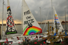 A flotilla of boats set sail from Norwalk's Cove on Saturday afternoon with brightly decorated sails, banners and jumbo signs showing the faces of the imprisoned group known as the "Arctic 30."