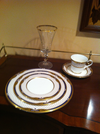Kennedy china pattern full set, crystal glasses to match, leather