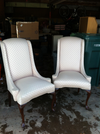 shelving, antique marble top side table, 2 straight back chairs.