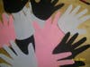 Trace around little hands and cut them out. If you are doing the cutting, several sheets of paper can be cut at once. Glue the hands together by overlapping the fingers on top of the palms of the previous hand. It will take about 12 hands to make a circle.