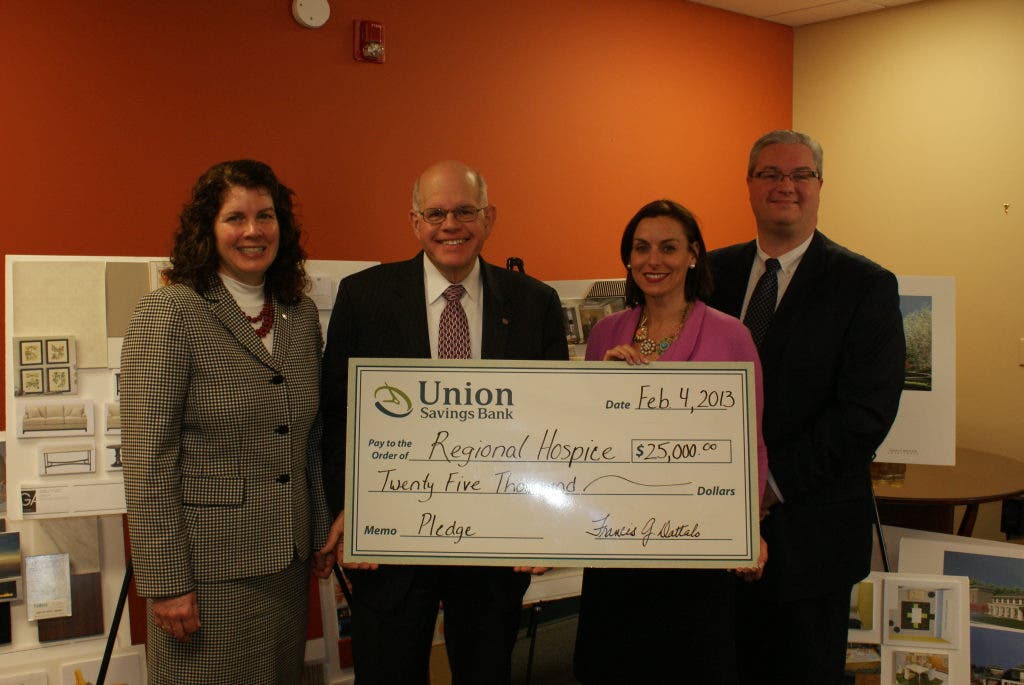 [Danbury, CT March 13, 2013] – Union Savings Bank in its continuing effort to support the local communities it serves, recently made a donation in the amount of $25,000.00 to Regional Hospice and Home Care of Western Connecticut. The funds will be allocated towards the building of an in-patient residence facility in Danbury.