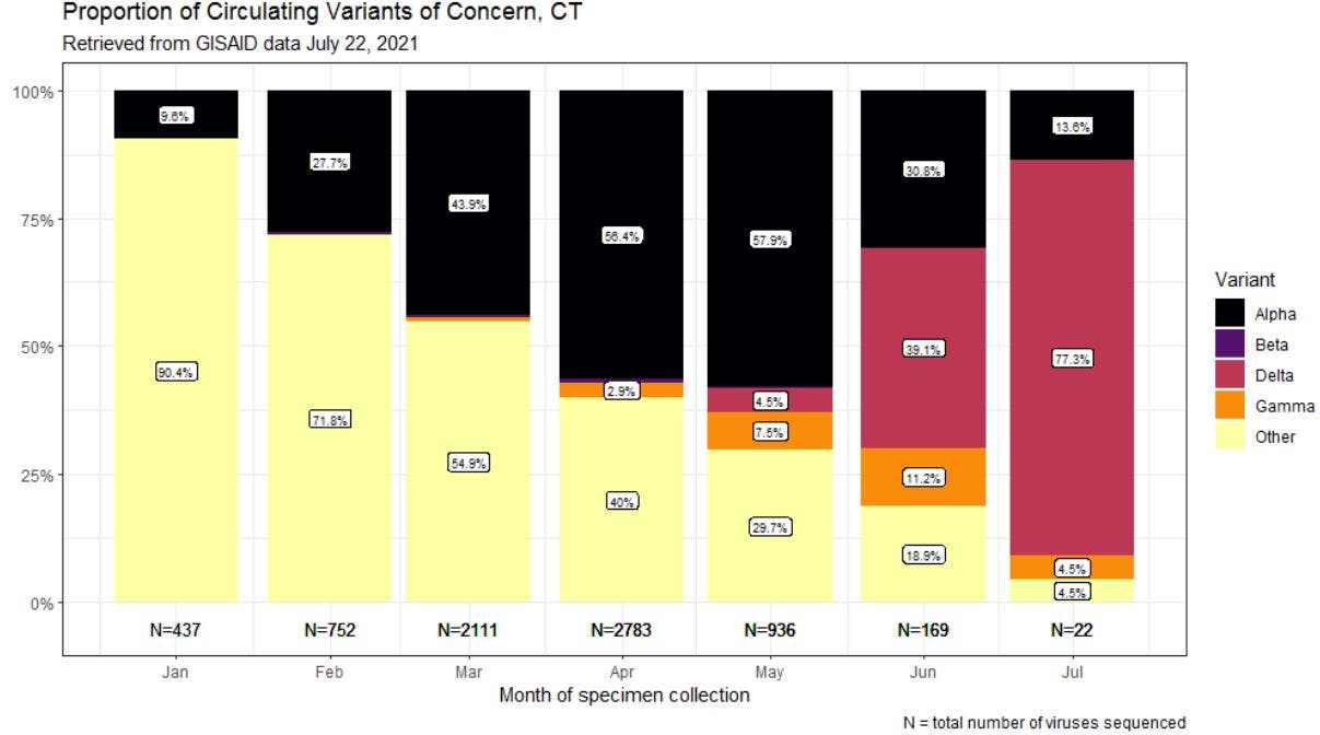 Over 77 percent of the coronavirus variants of concern in circulation in Connecticut are of the delta variety, according to the Global Initiative for Sharing Avian Influenza Data. That percentage has more than doubled in just the past month.