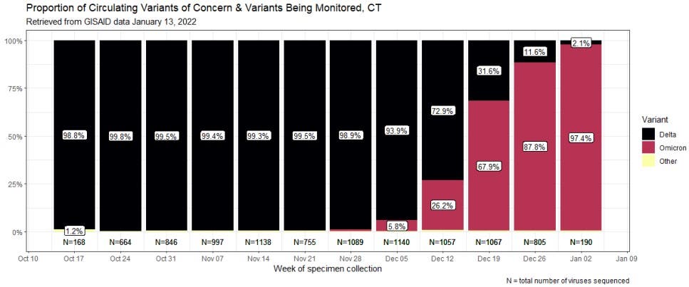 The Global Initiative on Sharing Avian Influenza Data is now the world's largest repository for SARS-CoV-2 sequences. The chart below is based on data extracted from GISAID on Thursday. It shows the change in proportion of circulating variants of concern in Connecticut since the beginning of October 2021.