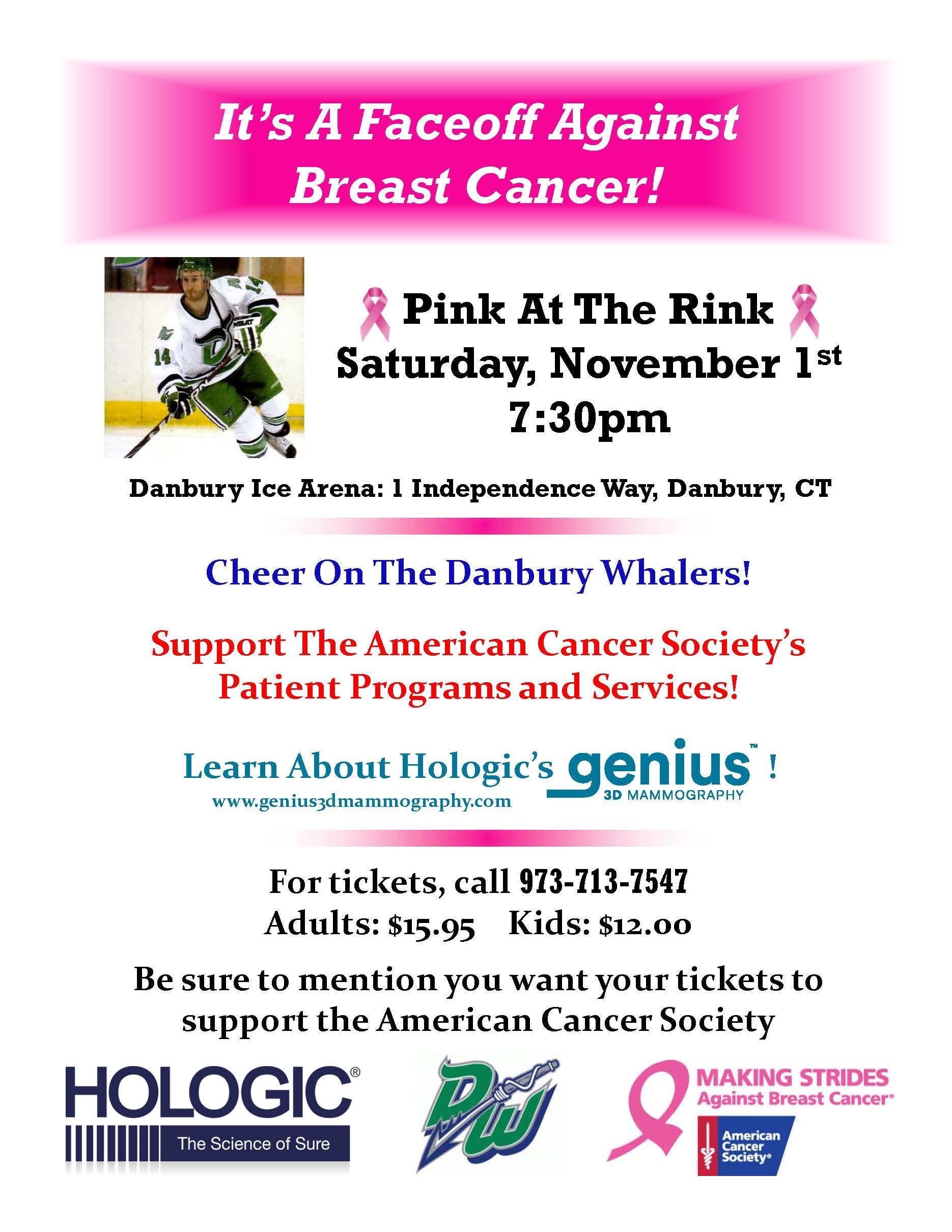 This night is a Faceoff Against Breast Cancer in partnership with the American Cancer Society and the Danbury Whalers.