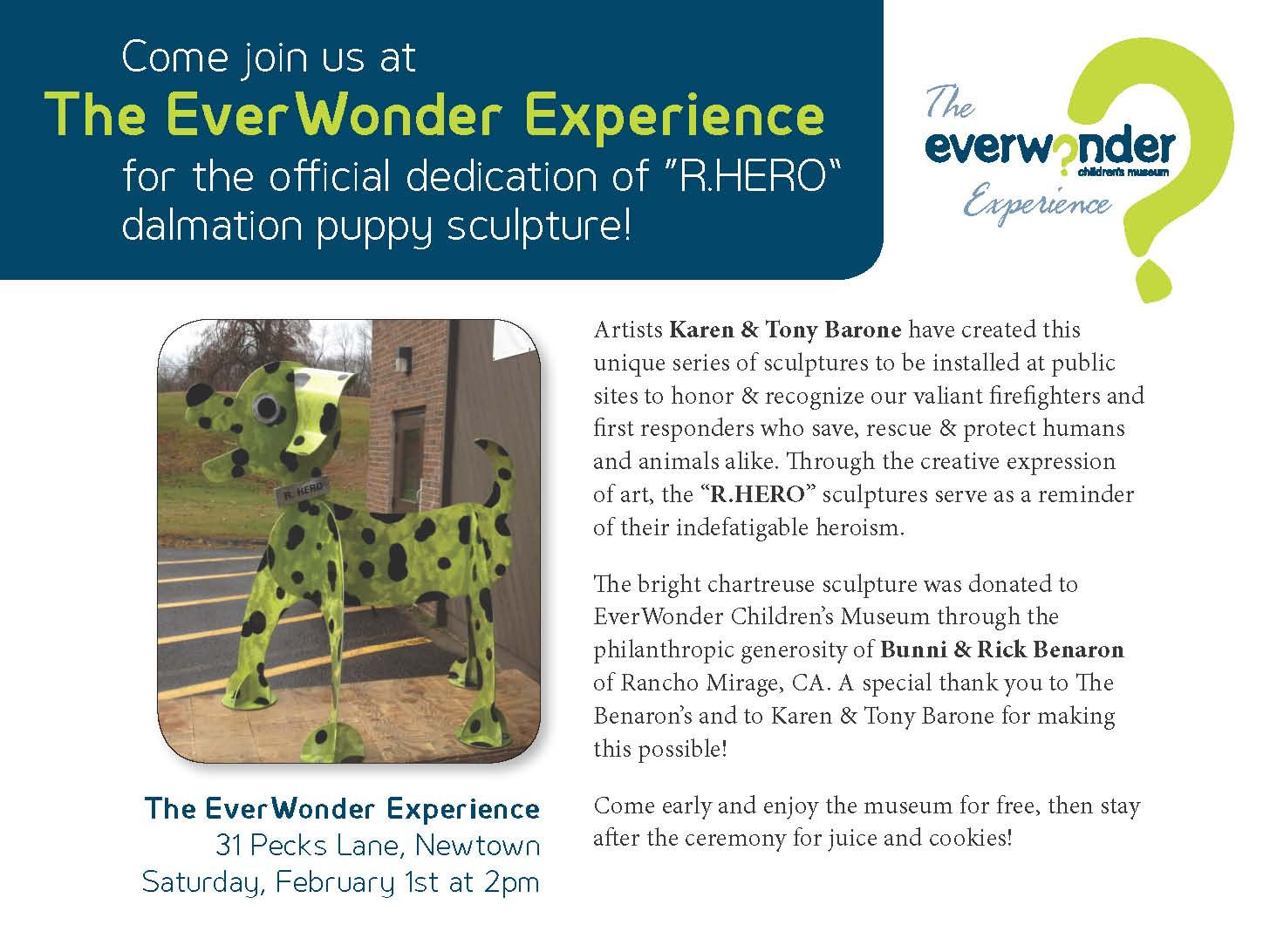 Come join us at The EverWonder Experience on Saturday, February 1st at 2 pm for the official dedication of the R.Hero Sculpture dedication ceremony.