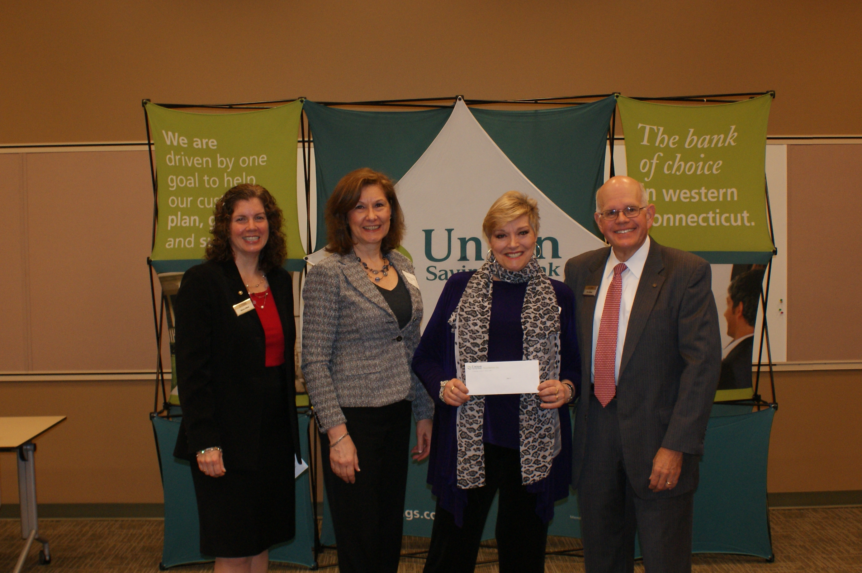 The Union Savings Bank Foundation awarded a grant in the amount of $7,500 to TBICO of Danbury. The funds will support their Corporate Edge Business Skills Program which offers practical, skills-based job training and access to career-track jobs that pay living wages. Career planning is the most important first step when setting goals to reach economic self-sufficiency and this program will put individuals on the right track to that independence. Pictured l-r: Marie O’Neill, Union Savings Bank Executive Vice President, Chief Marketing Officer; Catherine Keating, TBICO Communications and Development Coordinator; LouAnn Bloomer, TBICO Executive Director; and Fran Dattalo, Union Savings Bank President and CEO.