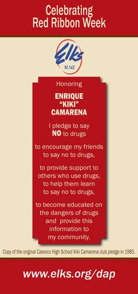 On Feb. 7, 1985, 37-year-old Camarena, who was working undercover in Mexico, was abducted in broad daylight. It is believed that five corrupt Mexican police officers ambushed him and shoved him into a car. One month later, Camarena’s body was found; he had been tortured to death. In honor of Camarena’s memory, sacrifice and his battle against illegal drugs, friends and neighbors began to wear red badges of satin.